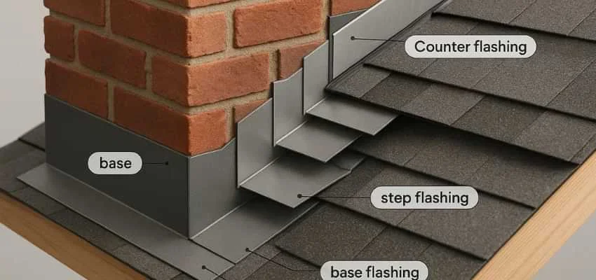 At the uphill side, pan flashing collects and directs runoff around the chimney. For wider stacks in Southlake Beach, Garland, we add a cricket to split water so it doesn't pond behind the masonry.